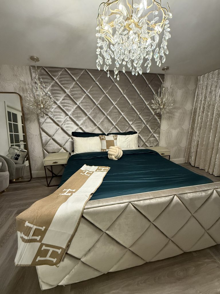 We make the bed with care, smoothing linens and arranging pillows for a clean finish.